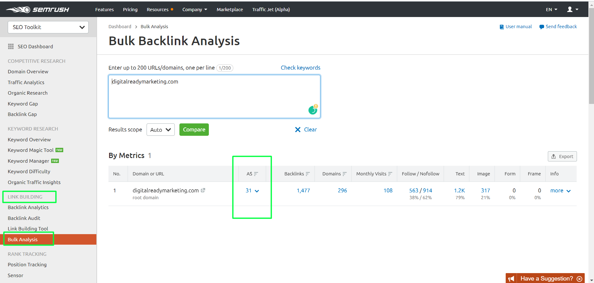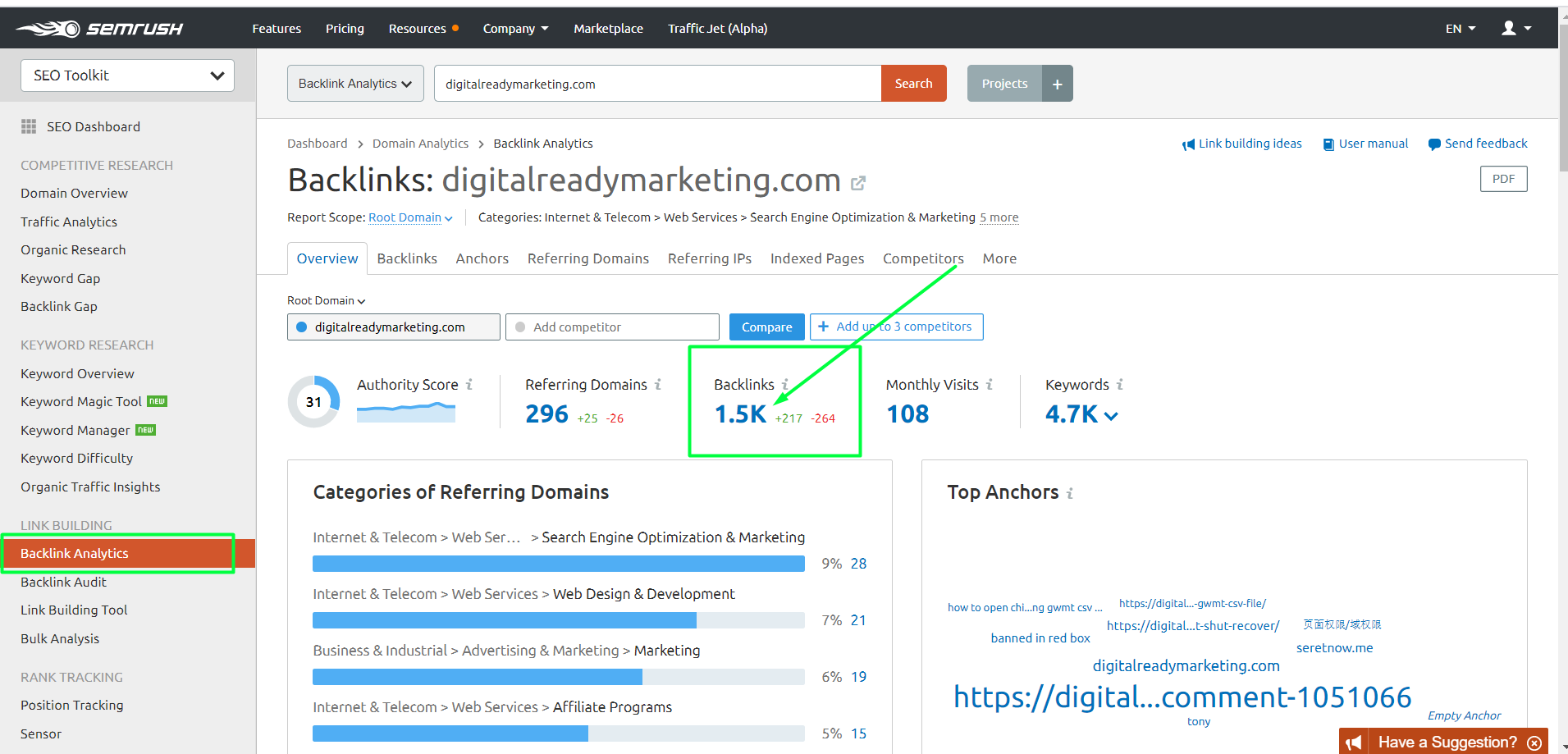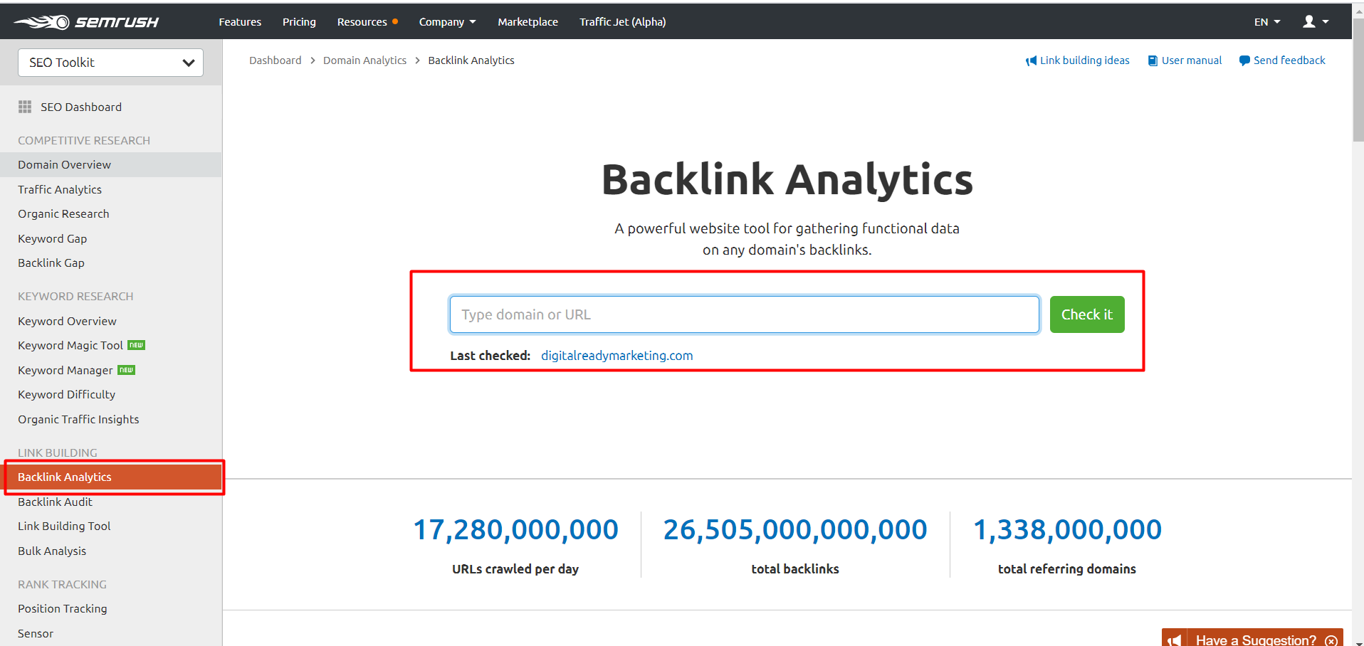 - In SEMrush dashboard, click Backlink Analytics under Link Building.