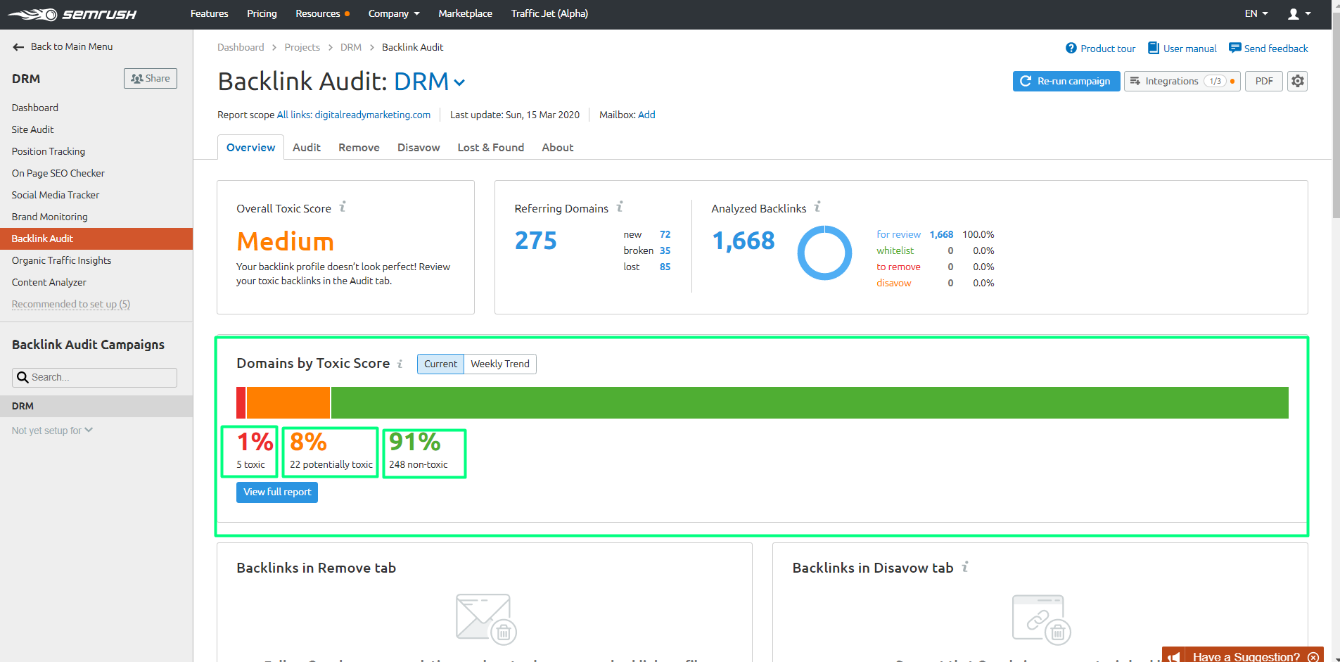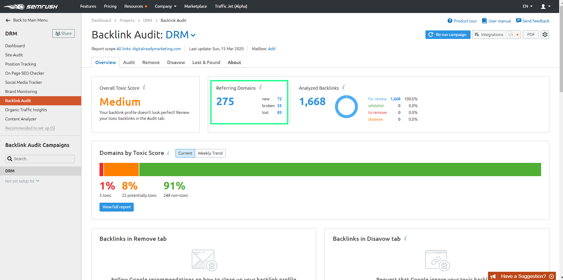 - In the SEMrush dashboard, click Backlink Audit