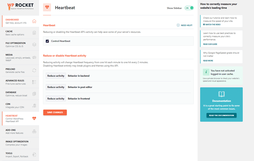 WP Rocket allows you to disable or reduce the activity behavior in your site’s backend, post editor and frontend – providing you with total control of the Heartbeat API efficiently.