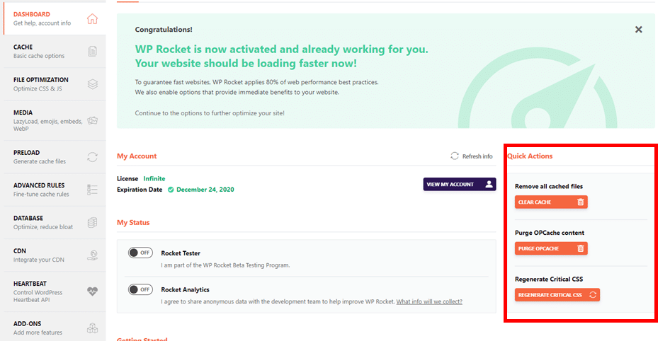 On the Dashboard page, it provides quick call-to-action buttons to clear cache files or regenerate critical CSS rendering path.