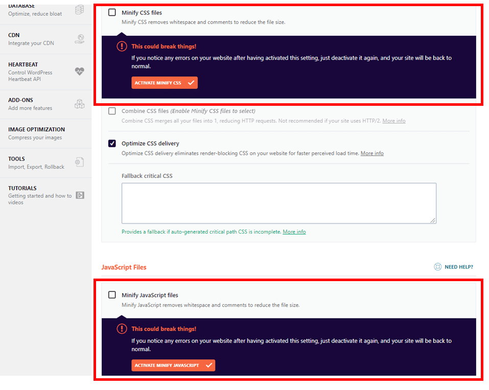 Enabling the Minify CSS and JavaScript files can cause errors on your site which is why settings here are not enabled by default.