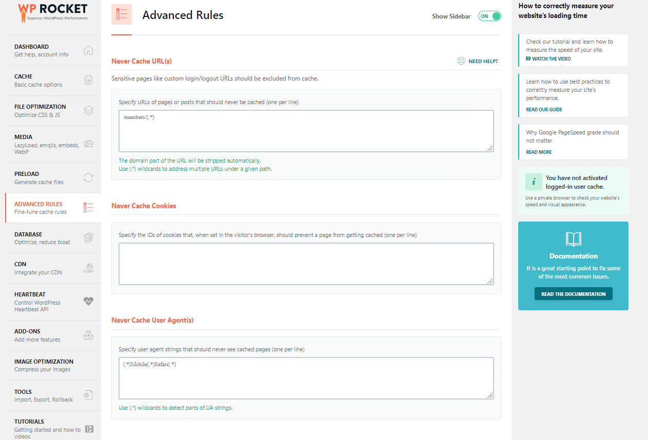 - User Cache – This setting best used for membership sites – if your website has restricted content for specific users. If activated, WP Rocket will create respective cache files for every logged in user in your site.