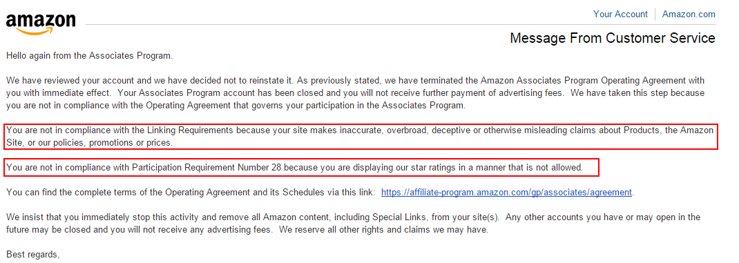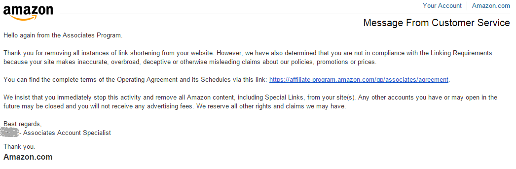 Few days went by and I got no response. I did some research online and found some people talking about how they got kicked out of Amazon affiliate program.