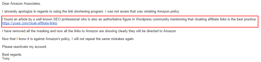 After processing all the information in my head, I immediately wrote back to the Amazon Associates team explaining why I did it and apologised.