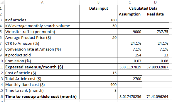 Assuming it would take 3 months to rank, and assuming all the articles are published in one go (which obviously is not the case but we are making a good enough business calculation rather than academically correct calculation), we can recoup the article costs in 8 months.