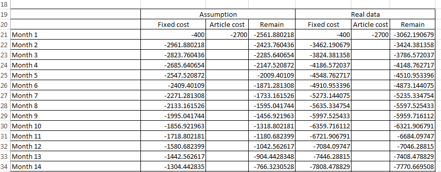 Based on the calculation, by producing 180 articles at $15 each with keywords targeting AMSV of at least 50. Even with monthly operation cost of $400, it will not only break even but become cash flow positive by 20th month (1 year and 8 months).