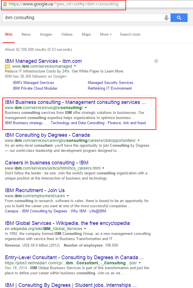 Image below shows IBM’s US site out ranking its Canadian site on Google.ca for search query “IBM counsulting”. This could potentially cause poor user experience, lost leads and sales.