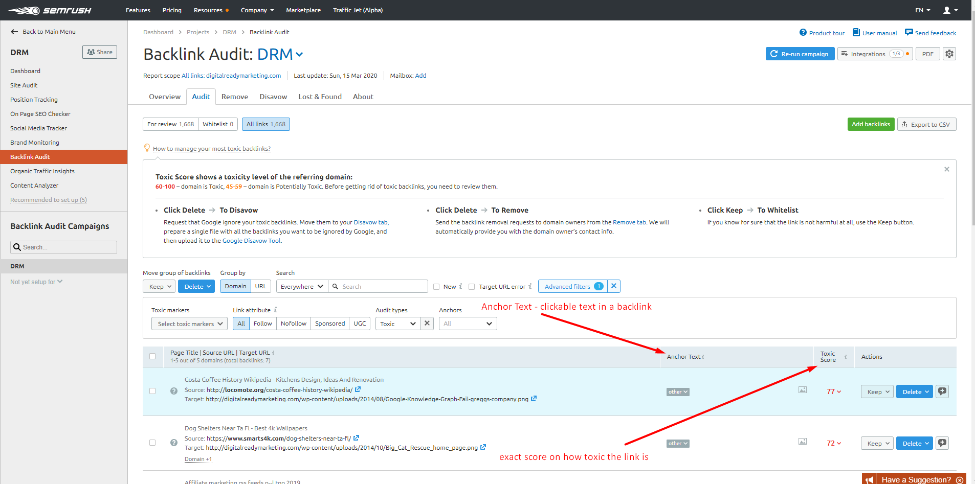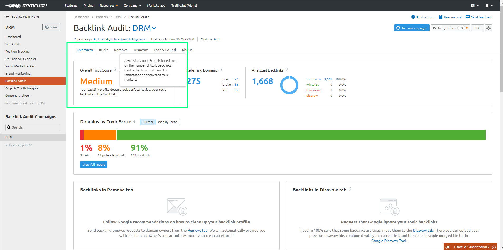 Good thing SEMrush has a Backlink Audit that can help you improve your website’s SEO by:
