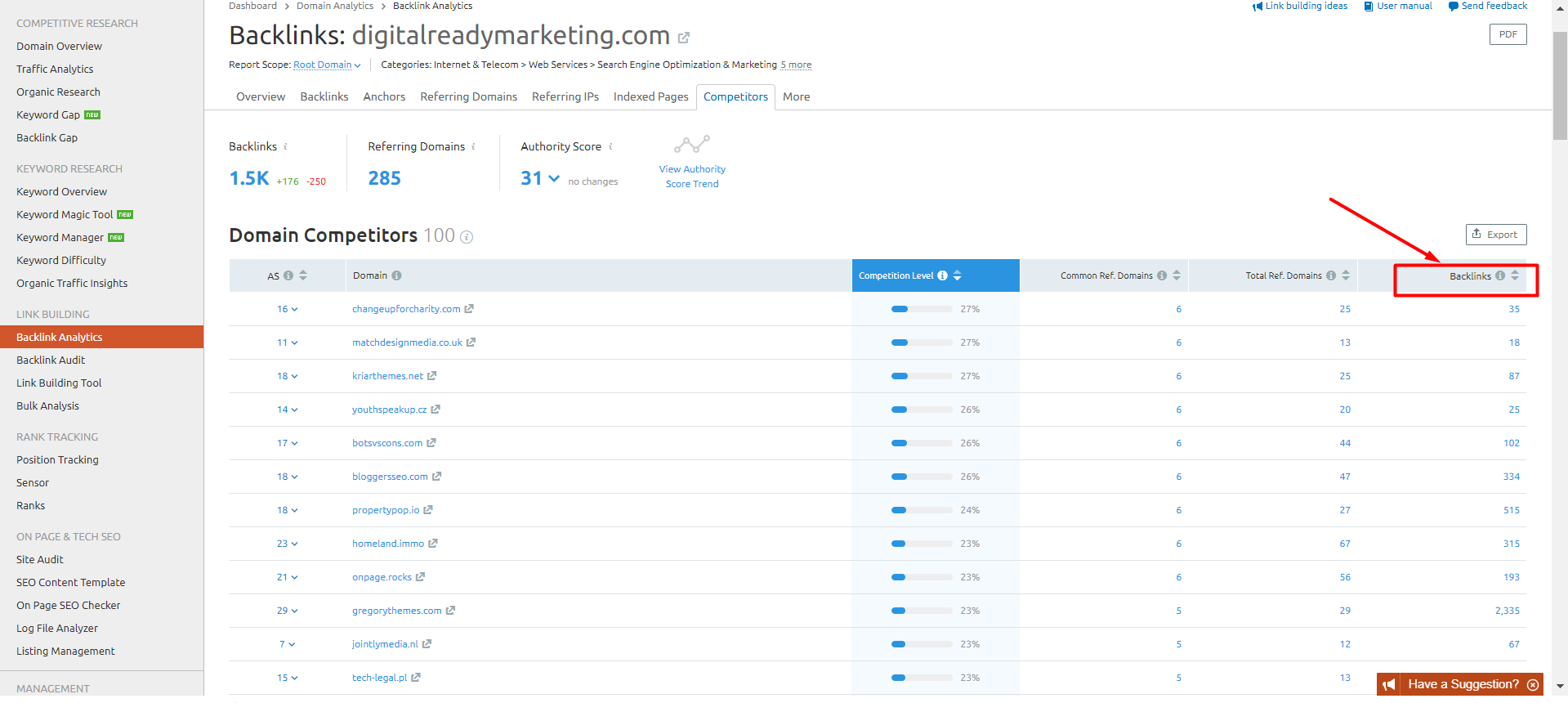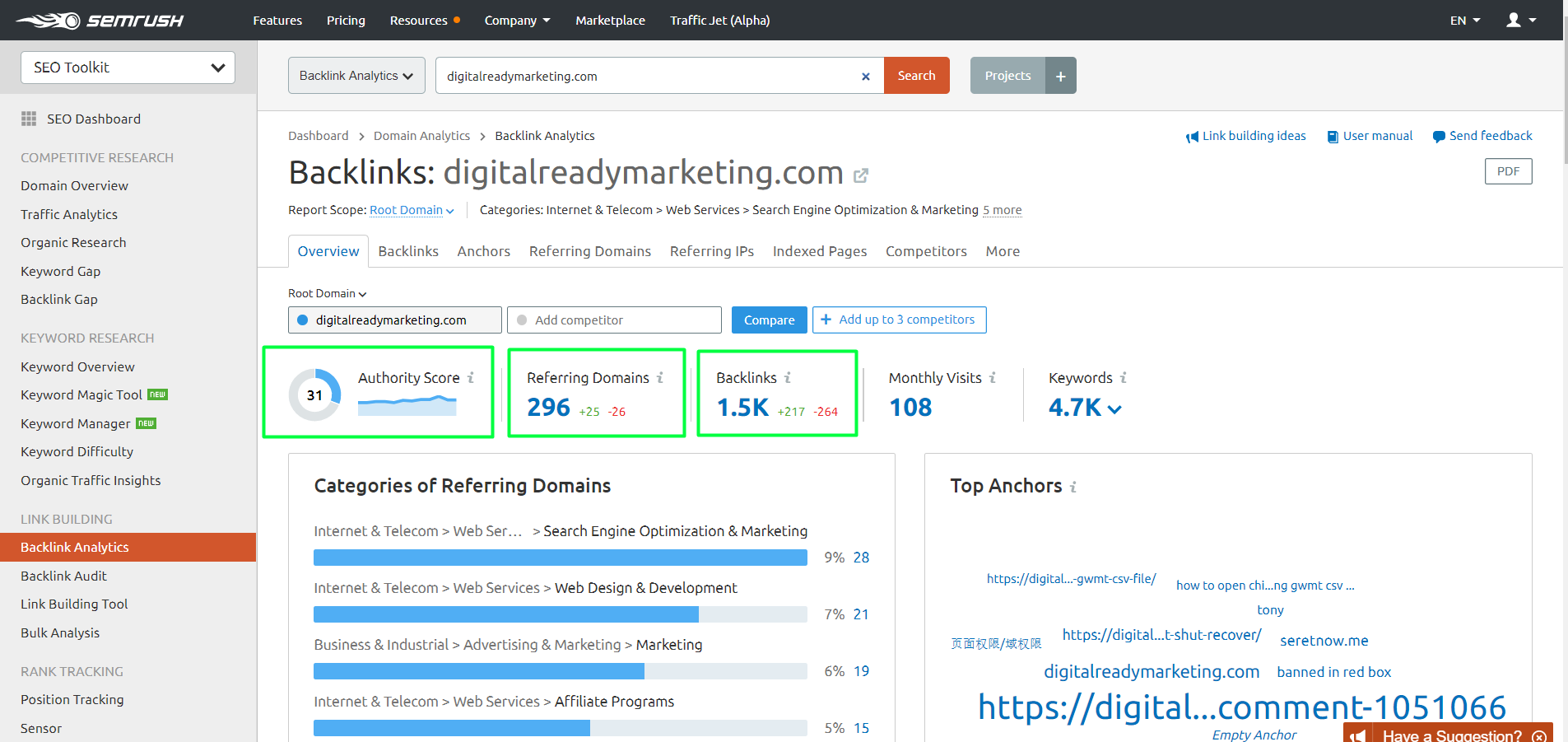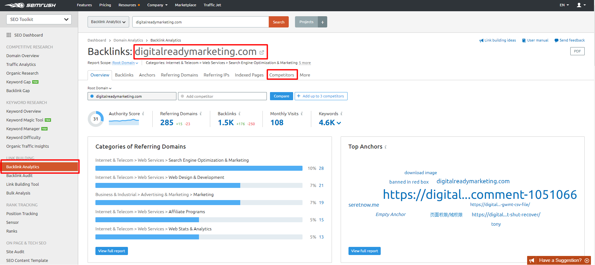 - In SEMrush dashboard, click Backlink Analytics under Link Building.