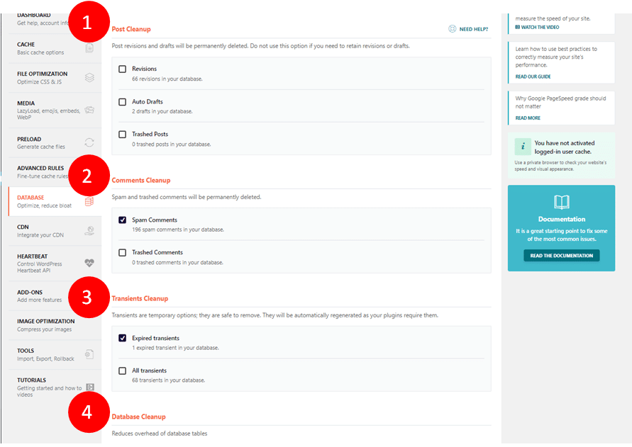 - Post Cleanup – WP Rocket detects all the unnecessary drafts, trash and post revisions in your site. You can permanently delete these files within WP Rocket.