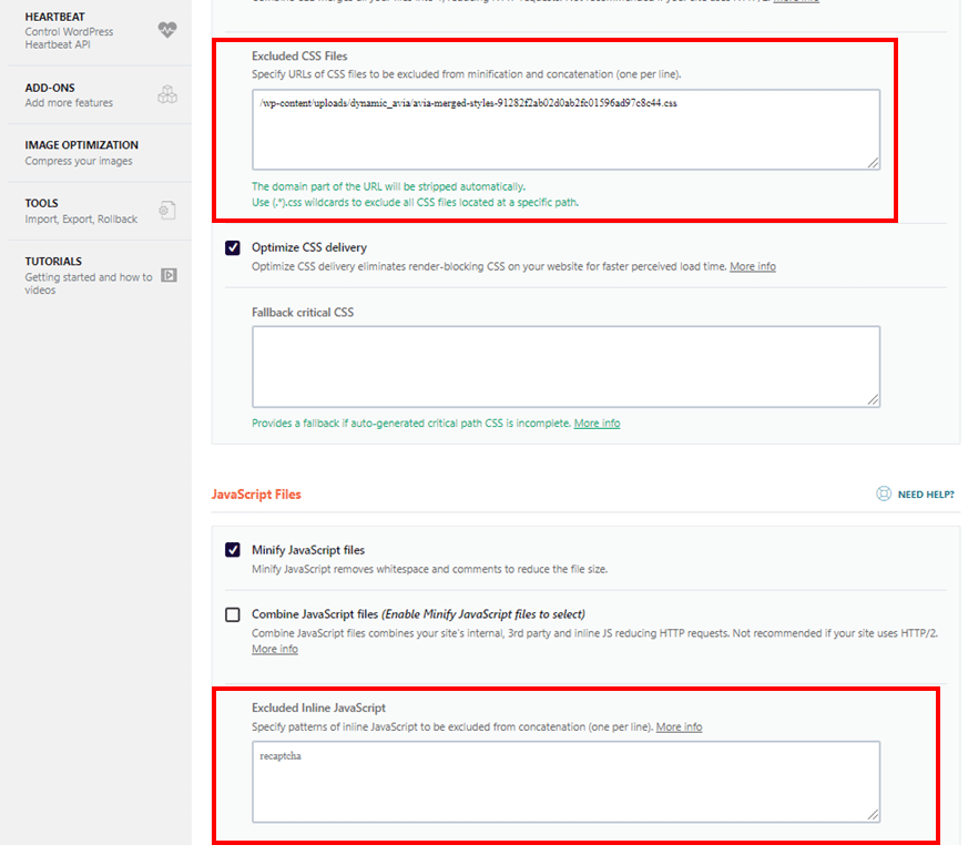 Excluded Inline JavaScript – excluded any JavaScript files you do not want to be optimized.