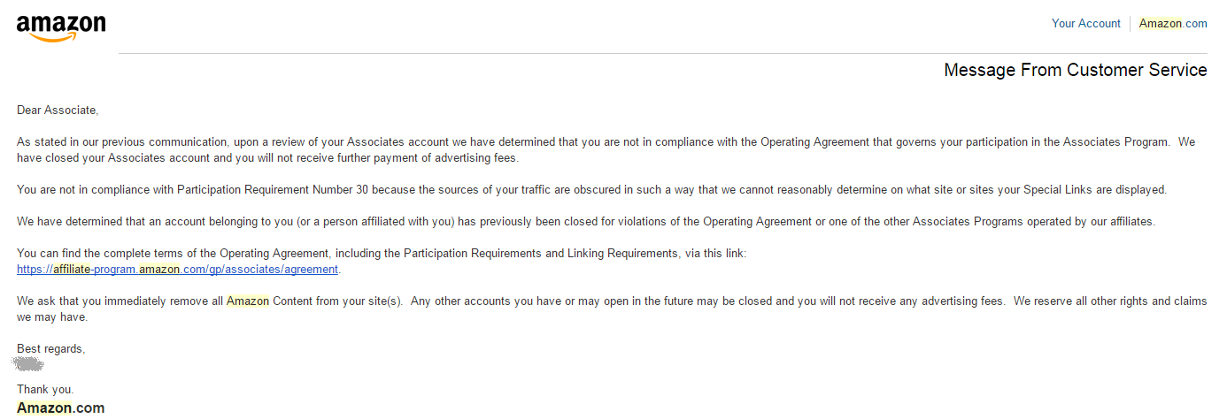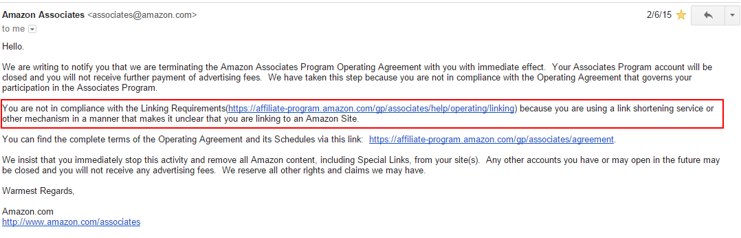 I still remember the day clearly…. On Saturday February 6th, 2015, I got an email from Amazon notifying me that my account was closed and no payment would be made for the advertising fee that I had earned up to that point.